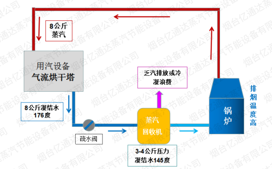 機理:(1)通過“專利技術”提取蒸汽余熱回用生產線,可以降低設備的蒸汽消耗量約15%。(2)可有效利用鍋爐煙氣余熱,使排煙溫度降低80°左右