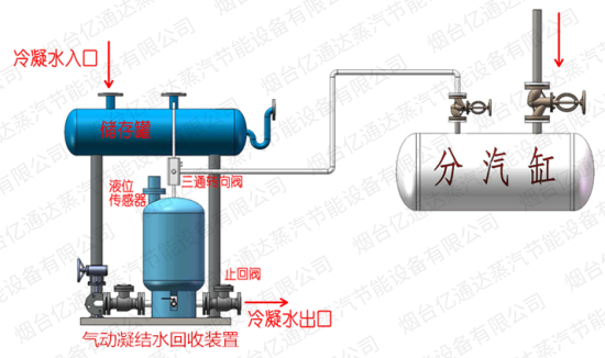 通過液位傳感自動轉動三通轉向閥,將高壓蒸汽導入時加壓罐內的壓力升高將凝結水輸送到其他地方,凝結水輸送完畢后,液位傳感自動轉動三通轉向閥將高壓氣體排除,下一個循環開始。