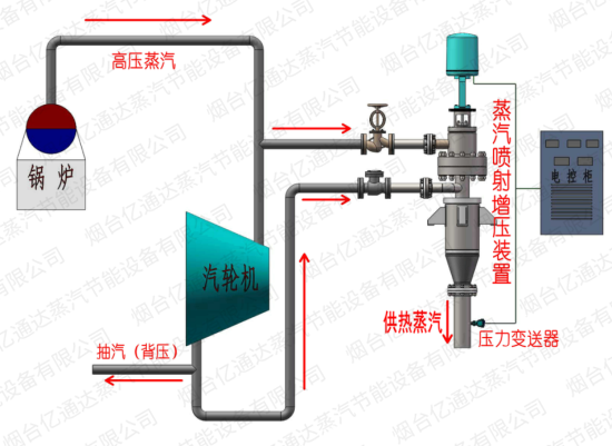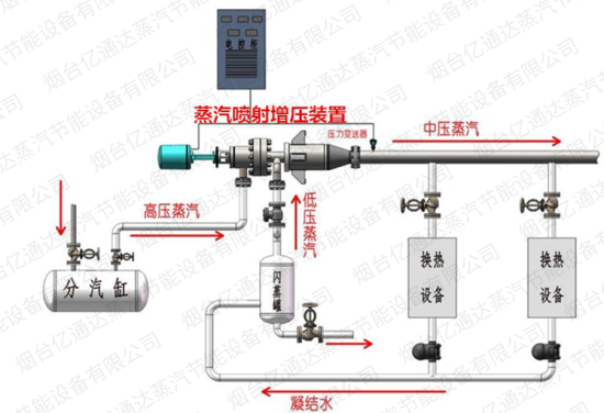 使用高參數蒸汽或者分氣缸壓力做高壓蒸汽將低壓蒸汽升壓后輸出工作蒸汽,輸出口安裝壓力變送器,可調節執行機構,確保在蒸汽流量波動時,仍可輸出穩定的工作蒸汽。